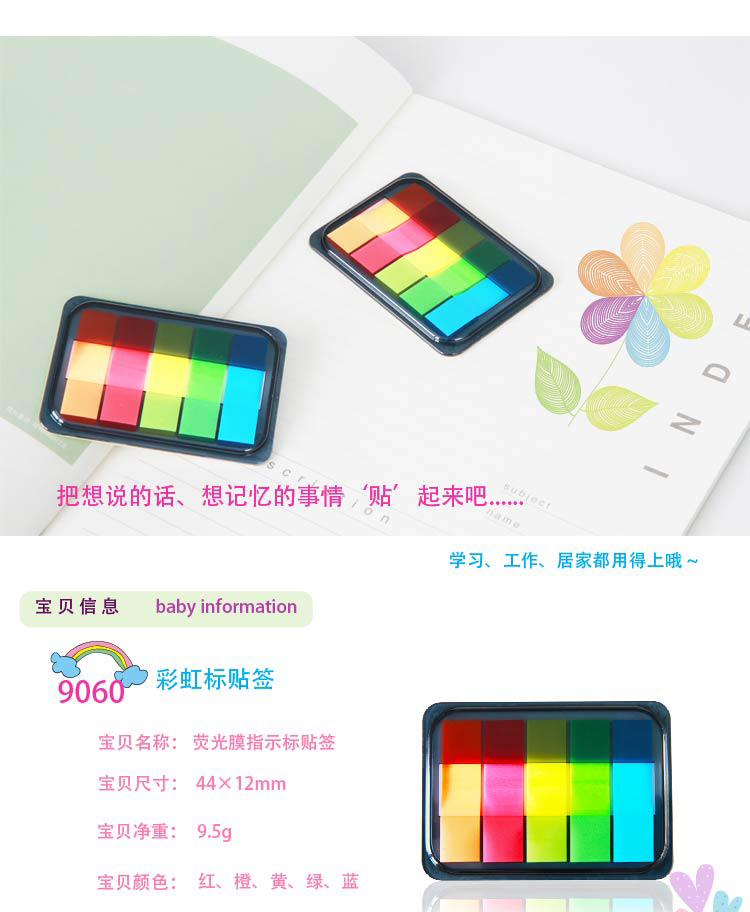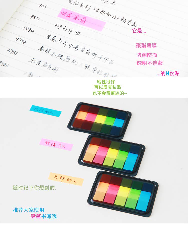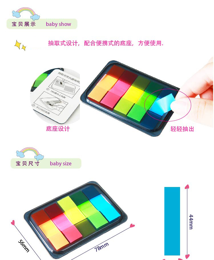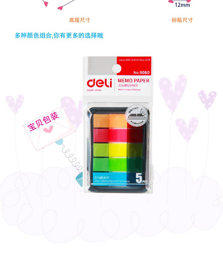 商品名称:得力(deli)100张5色荧光膜指示标签贴 9060抽取式便签条记事贴 45*12mm(单位:包)