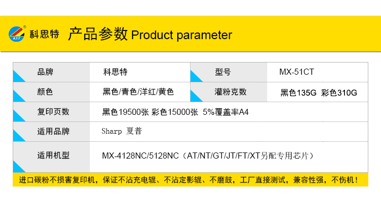 商品名称:科思特 MX-51CTK(带芯片) 粉盒 适用夏普 MX-4128NC/5128NC (AT/NT/GT/JT/FT/XT另配专用芯片) 黑色
