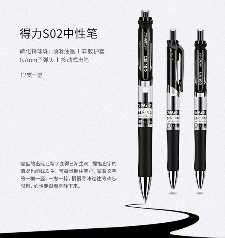 商品名称:得力(deli) S02按动中性笔 0.7mm签字笔 黑色 12支/盒