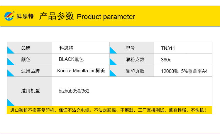 商品名称:科思特 TN-311 粉盒 适用柯尼卡美能达 bizhub350/362 黑色