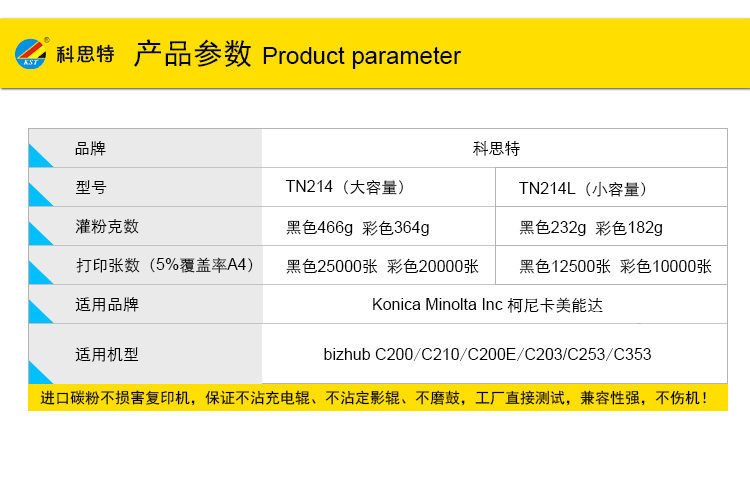 商品名称:科思特 TN-214-K(带芯片) 粉盒 适用柯尼卡美能达 bizhub C200/C210/C200E/C203,C253/c353/8650DN/7720/C7721 黑色