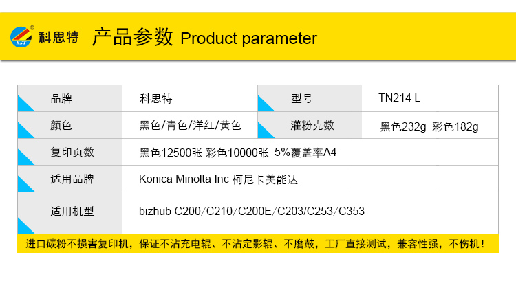 商品名称:科思特 TN214L-K(带芯片) 粉盒 适用柯尼卡美能达 bizhub C200/C210/C200E/C203,C253/c353/8650DN/7720/C7721 黑色