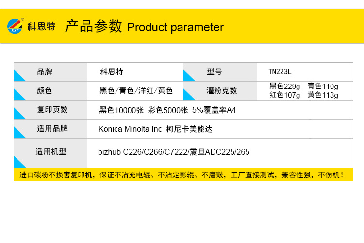 商品名称:科思特 TN223L/ADT225L 粉盒 适用柯尼卡美能达 bizhub C226/C266/C7222/震旦ADC225/265 黑色