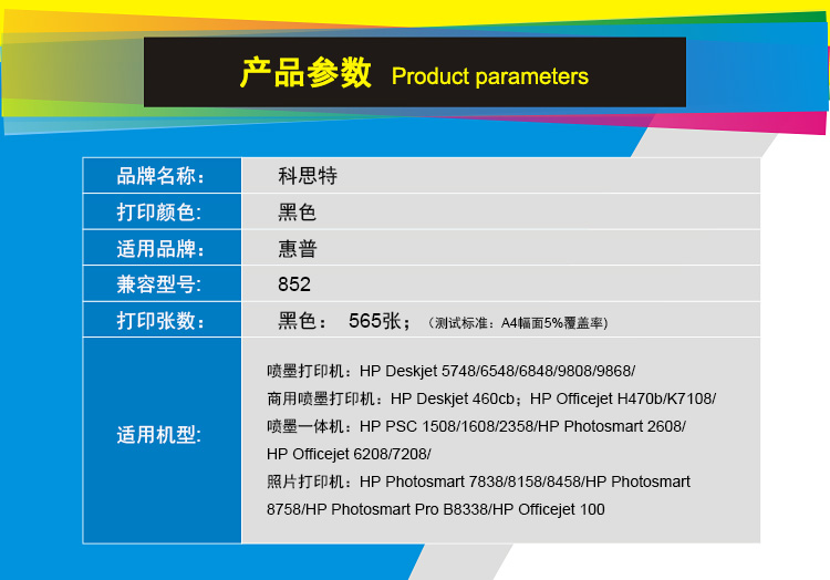 商品名称:科思特 852(8765) BK 黑色墨盒 适用惠普Deskjet 5748/6548/6848/9808/9868/Deskjet 460cb/Officejet H470b/K7108/Photosmart 2608/Officejet