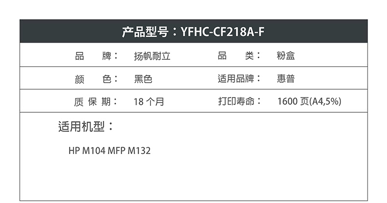 扬帆耐立YFHC CF218A黑粉(带芯片) 适用:HP M104 MFP M132