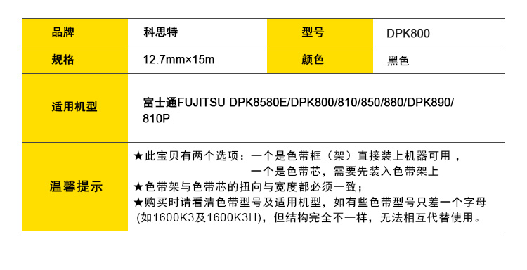 商品名称:科思特 DPK8580E/DPK800 色带芯 适用富士通 DPK810 头架和带芯焊接在一起 黑色