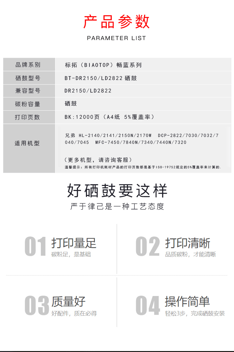 商品名称:标拓 (Biaotop)畅蓝系列 DR2150/LD2822硒鼓架 适用于:兄弟HL2140 2150N DCP7030 7040 MFC7340 7450 联想LJ2200