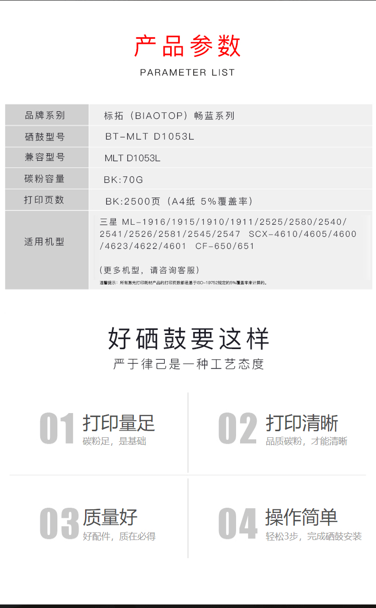 商品名称:标拓 (Biaotop)畅蓝系列 MLTD1053L硒鼓 适用于:三星1916/1915/1910/2525/2580 SCX-4610/4605/4600