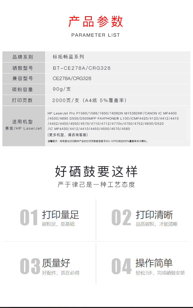 商品名称:标拓 (Biaotop)畅蓝系列 CE278A/CRG328硒鼓 适用球场地:佳能MF4712/4752 LBP6230DN/L150