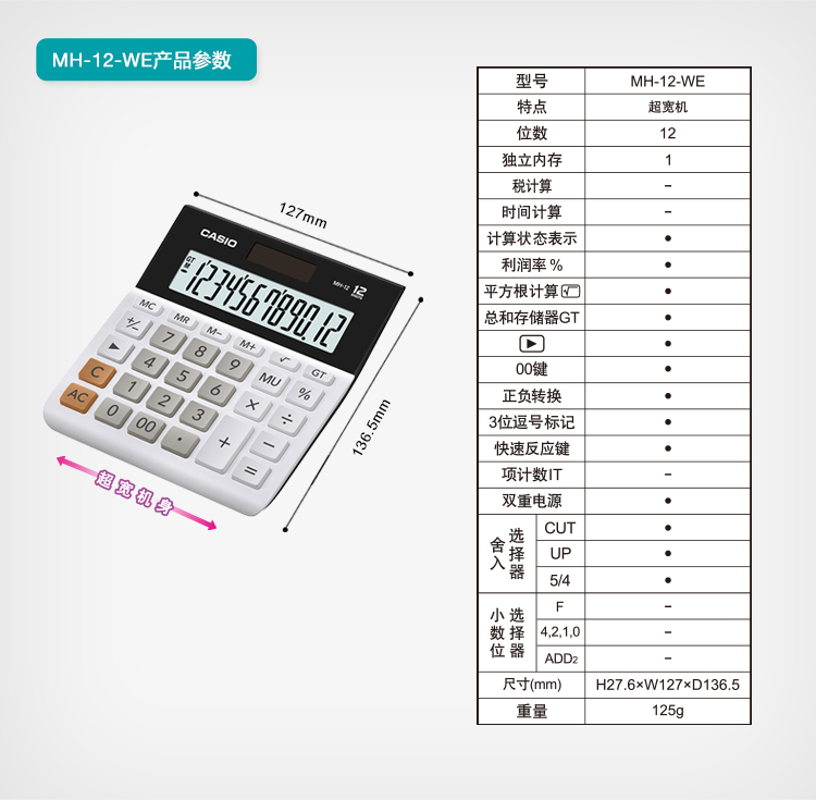商品名称:卡西欧(CASIO)12位 办公宽屏计算器 MH-12-WE