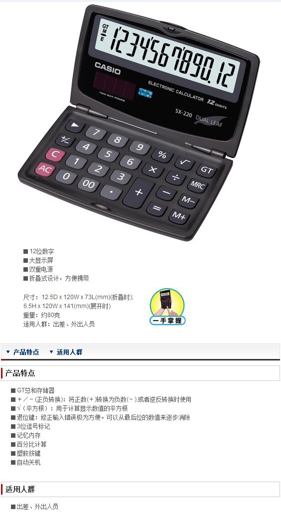 商品名称:卡西欧(CASIO)12位 便携计算器 SX-220