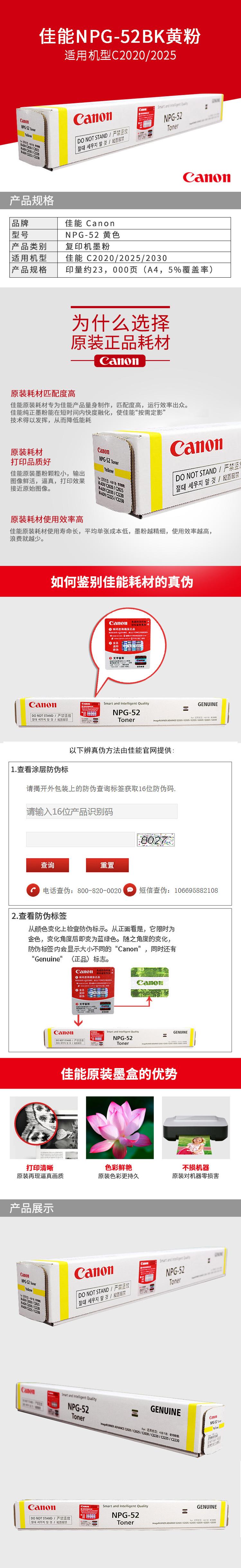 商品名称:佳能(Canon)NPG-52 Y 黄色墨粉盒(适用于:C2020/2025/2030)