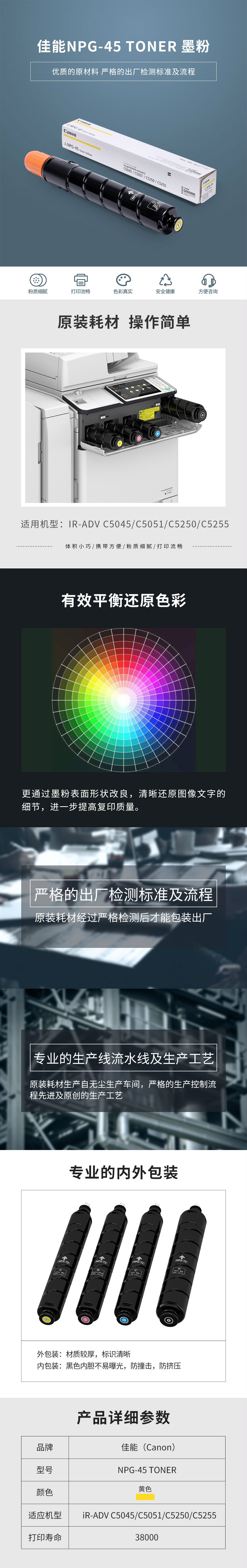 商品名称:佳能(Canon)NPG-45 Y 黄色墨粉盒(适用于:iR-ADV C5045、iR-ADV C5051、iR-ADV C5250、iR-ADV C5255)