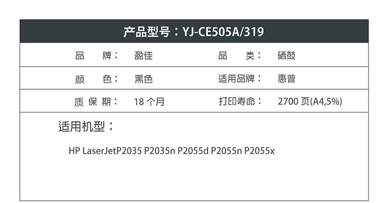 商品名称:盈佳YJ CE505A/319黑鼓(带芯片) 适用机型:HP LaserJetP2035 P2035n P2055d P2055n P2055x