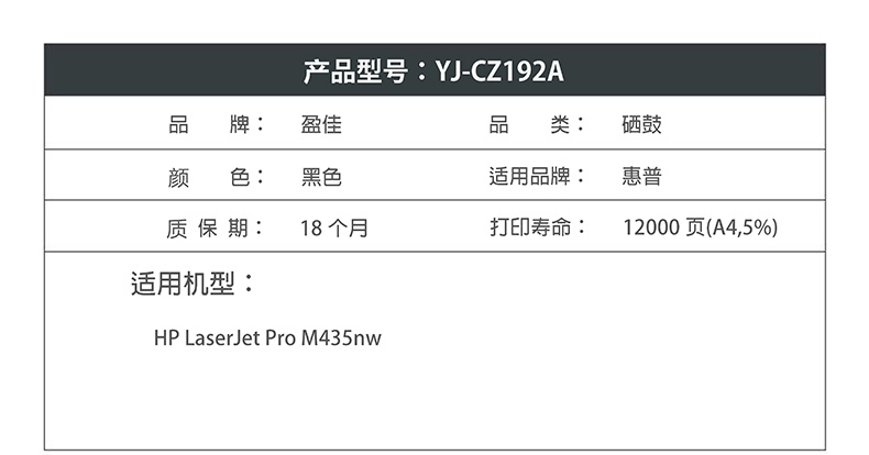 商品名称:盈佳YJ CZ192A(93A)黑鼓(带芯片) 适用机型:HP LaserJet Pro M435nw