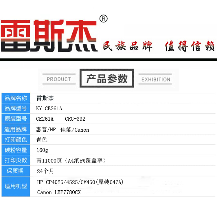 商品名称:雷斯杰 KY-CE261蓝色硒鼓 适用惠普:HP CP4025/4525/CM450/CanonLBP7780CX