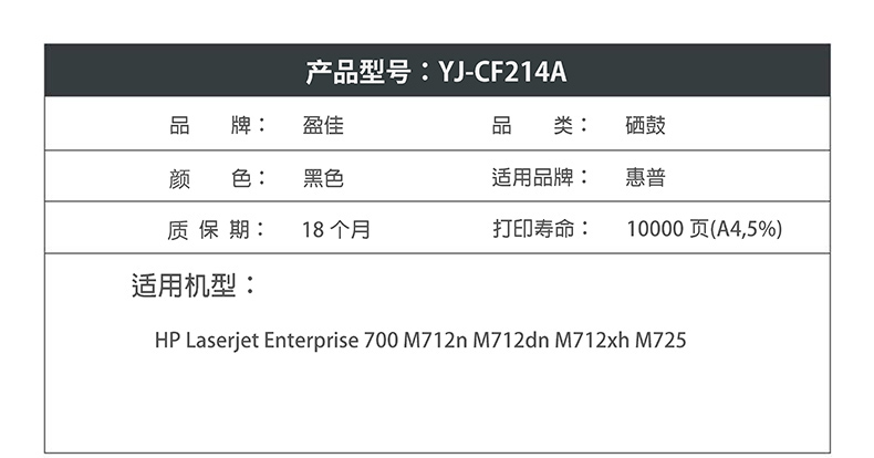商品名称:盈佳YJ CF214A黑鼓(带芯片)适用机型:HP Laserjet Enterprise 700 M712n M712dn M712xh M725