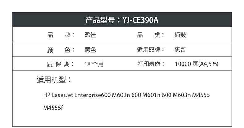 商品名称:盈佳YJ CE390A黑鼓(带芯片) 适用机型:HP LaserJet Enterprise600 M602n 600 M601n 600 M603n M4555 M4555f