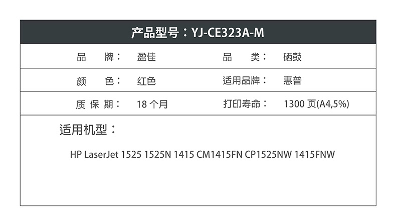 商品名称:盈佳YJ CE323A(128A)红鼓(带芯片) 适用机型:HP LaserJet 1525 1525N 1415 CM1415FN CP1525NW 1415FNW