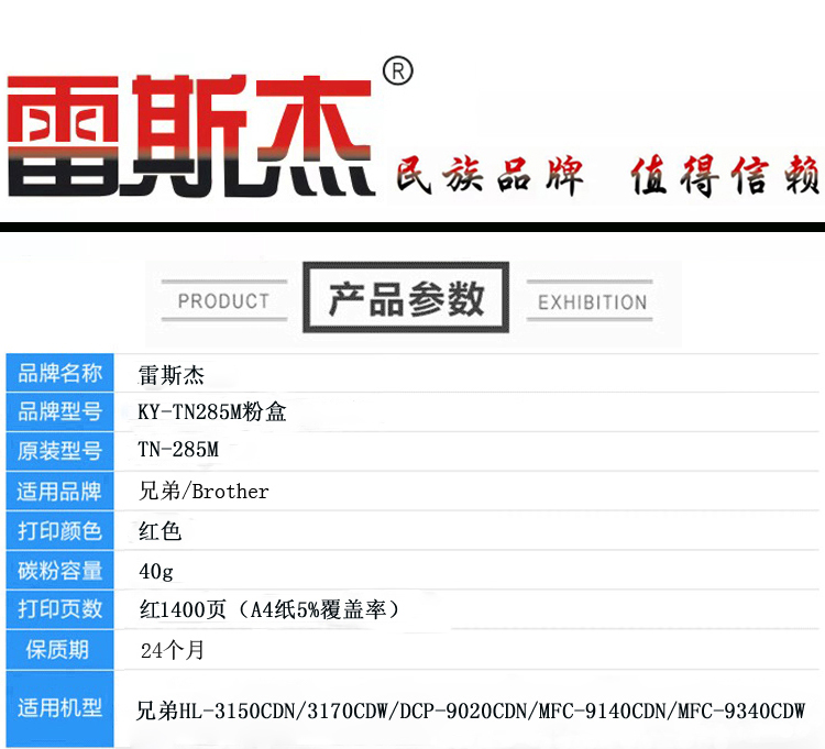 商品名称:雷斯杰 KY-TN285红色粉盒 适用兄弟:兄弟HL-3150CDN/3180CDW/DCP9020CDN/MFC9140CDN/MFC9340CDW