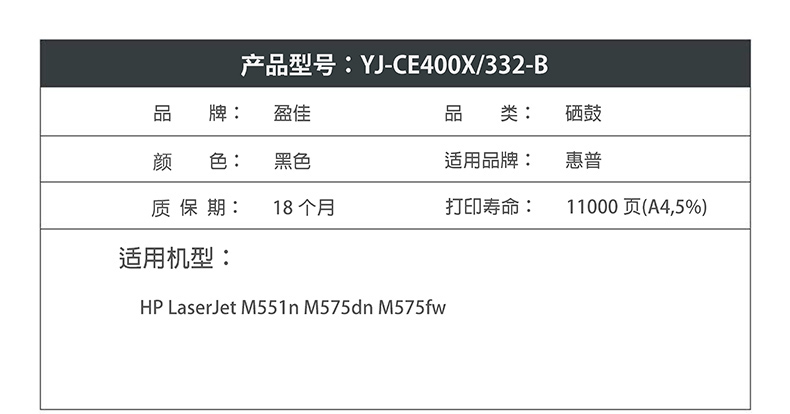 商品名称:盈佳YJ CE400X(507X)/332黑鼓(带芯片) 适用机型:HP LaserJet M551n M575dn M575fw