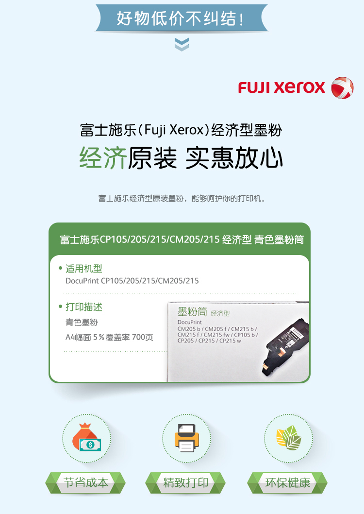 商品名称:富士施乐(Fuji Xerox)CT202546 青色(经济型)原装墨粉盒(适用于:富士施乐DocuPrint CP105b;富士施乐DocuPrint CM215fw;富士施乐DocuPrint CM215b)