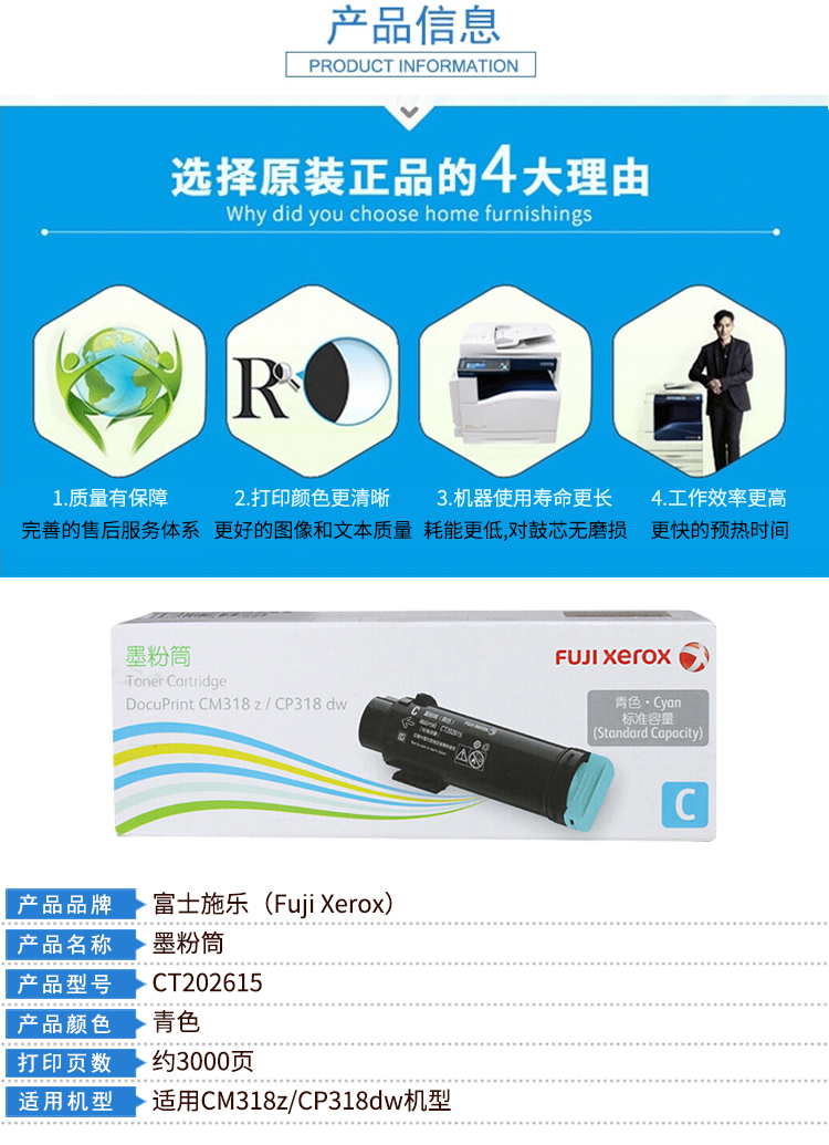 商品名称:富士施乐(Fuji Xerox)CT202615 青色墨粉盒(适用于:富士施乐DocuPrint CM318z;富士施乐DocuPrint CP318dw)