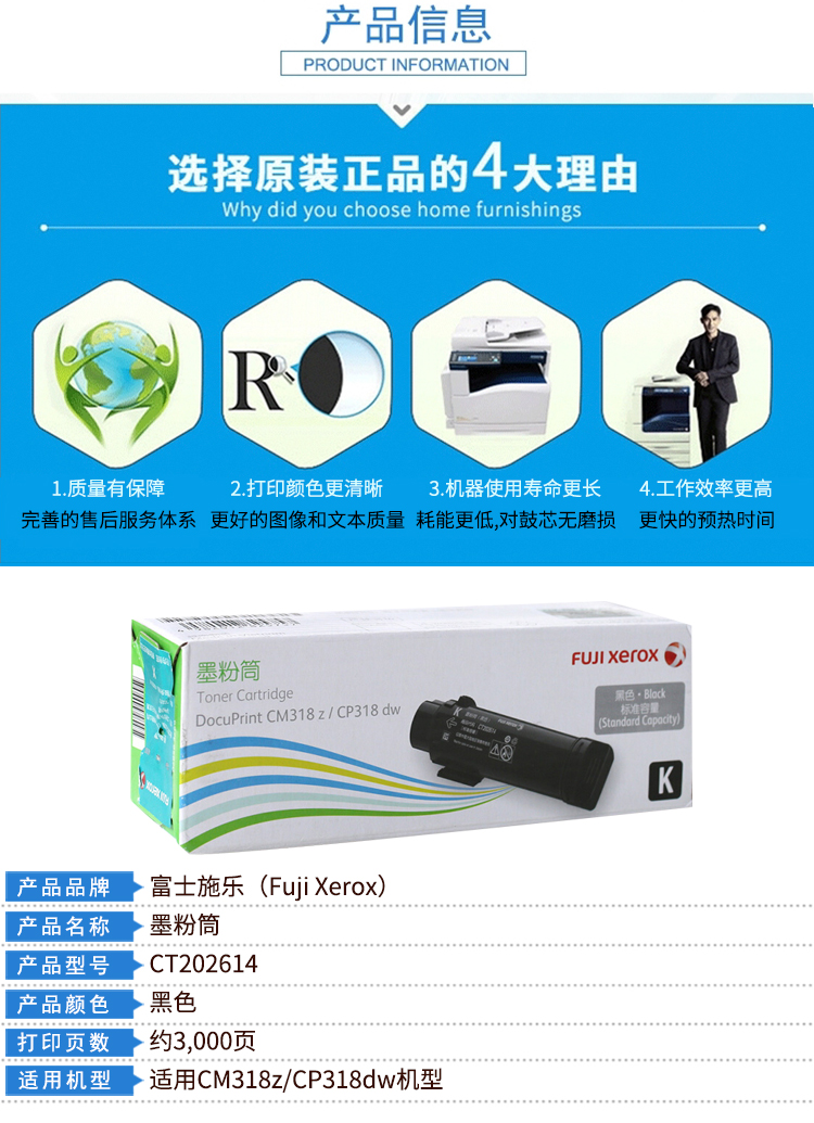 商品名称:富士施乐(Fuji Xerox)CT202614 黑色墨粉盒(适用于:富士施乐DocuPrint CM318z;富士施乐DocuPrint CP318dw)