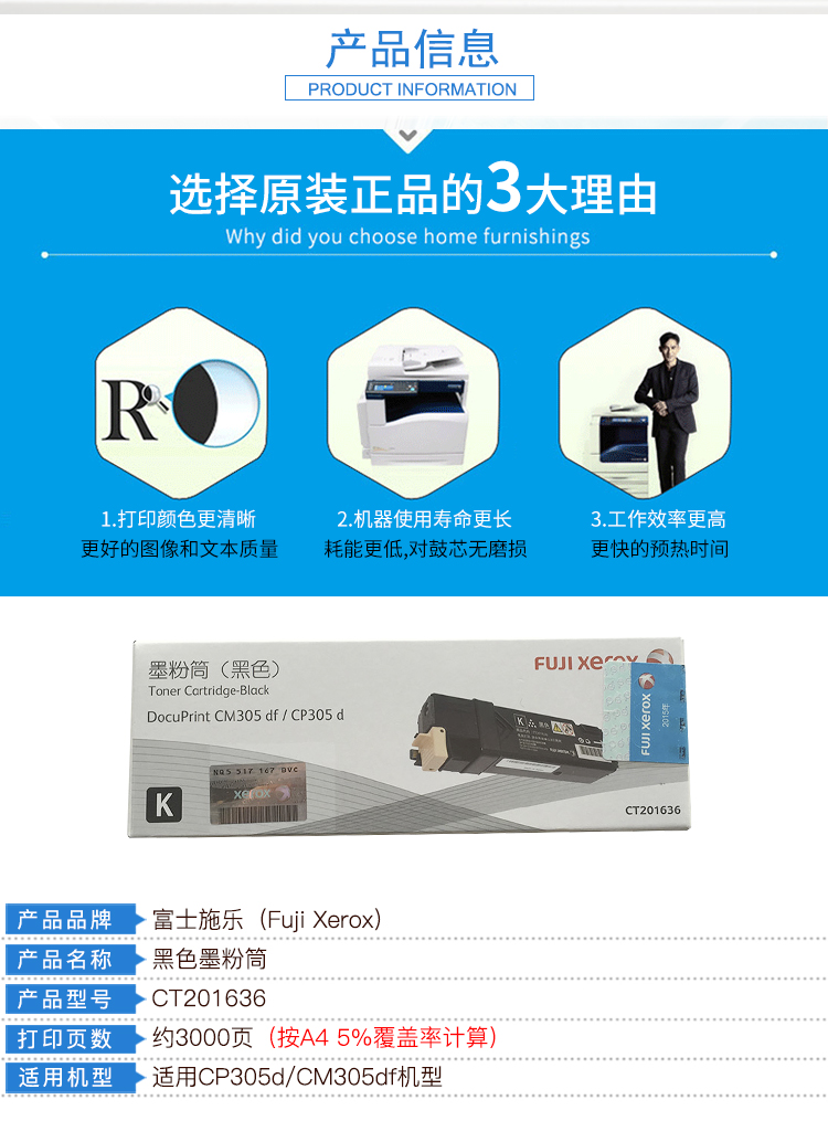 商品名称:富士施乐(Fuji Xerox)CT201636 黑色墨粉盒(适用于:DocuPrint CM305df/CP305d)