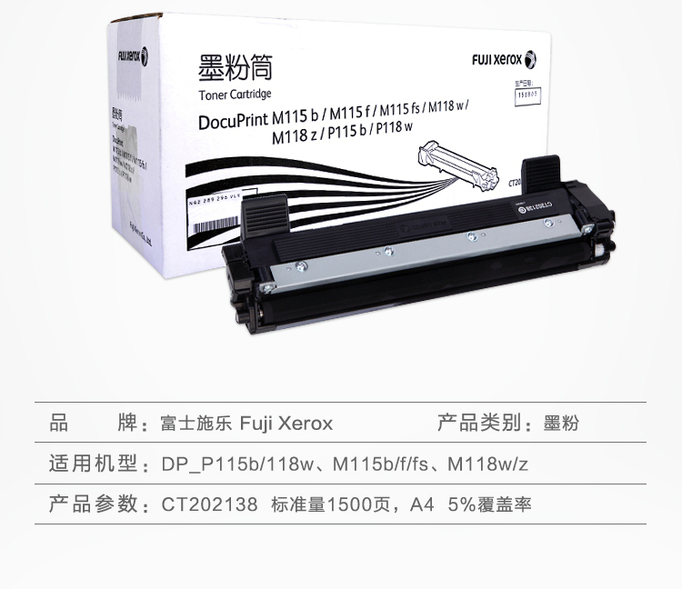 商品名称:富士施乐(Fuji Xerox) CT202138 黑色墨粉盒 (适用于:M115b;M115f;M115fs;M118w;M118z;P115b;P118w)