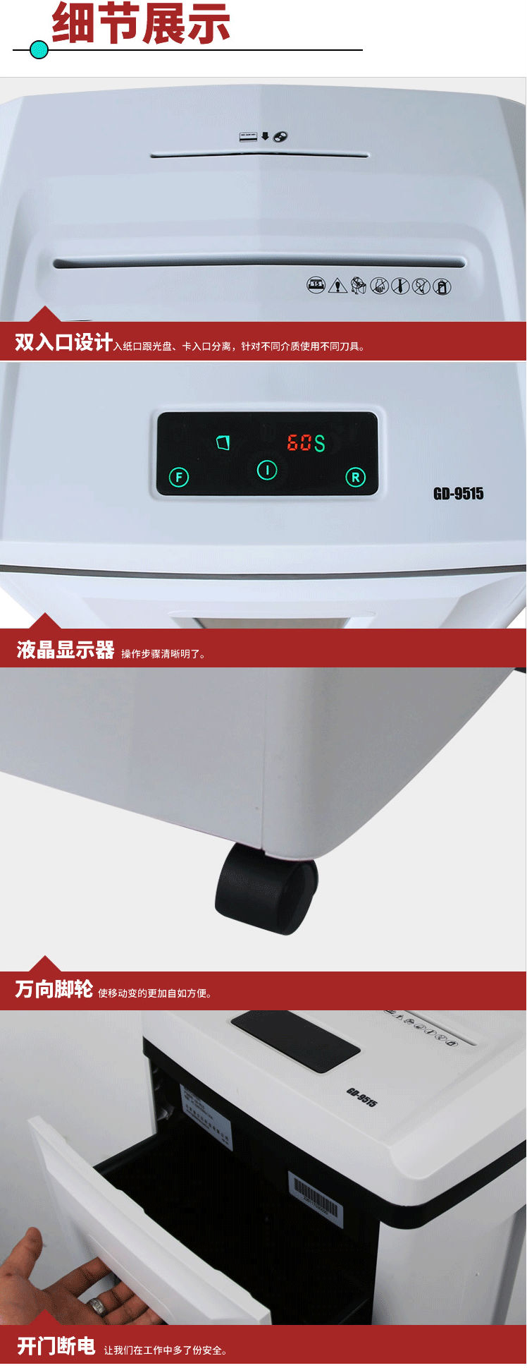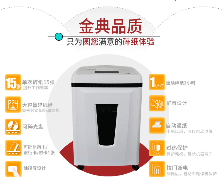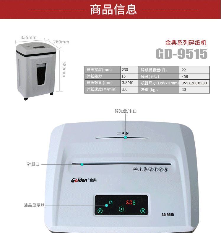 商品名称:金典(Golden)GD-9515 碎纸机办公电动 碎纸机段状大功率静音碎纸机