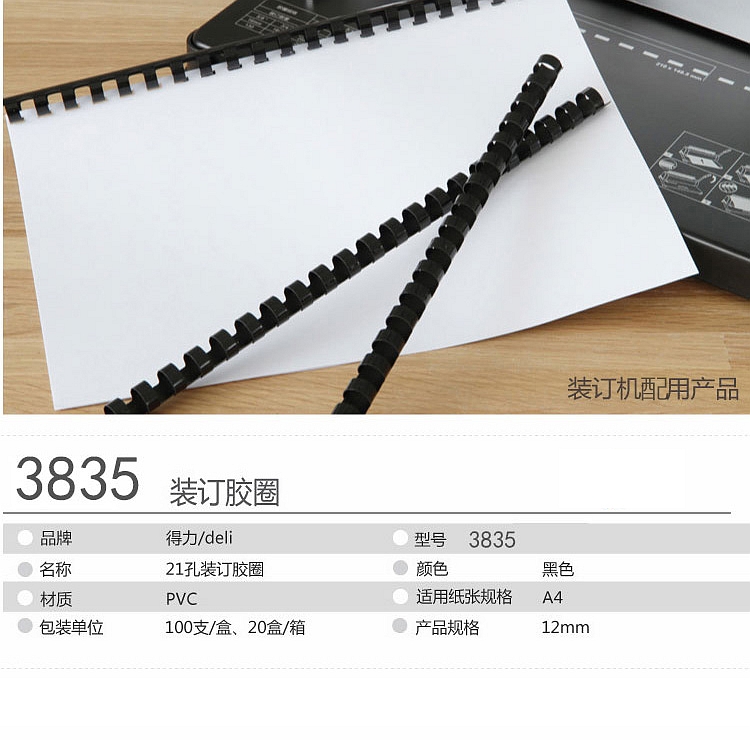 商品名称:得力3835-21孔装订胶圈(黑)(100支/盒)