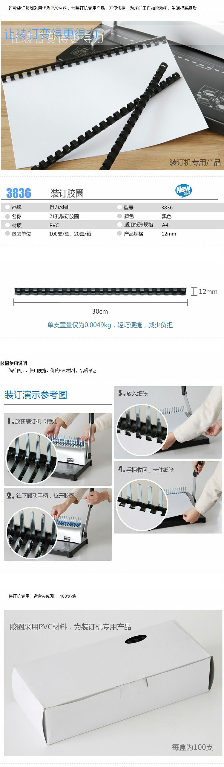 商品名称:得力3836-21孔装订胶圈(黑)(100支/盒)