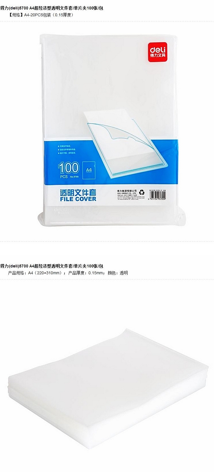 商品名称:得力(deli)A4L型文件套 透明单片夹 加厚二页式资料文件夹 5700(100只/包)