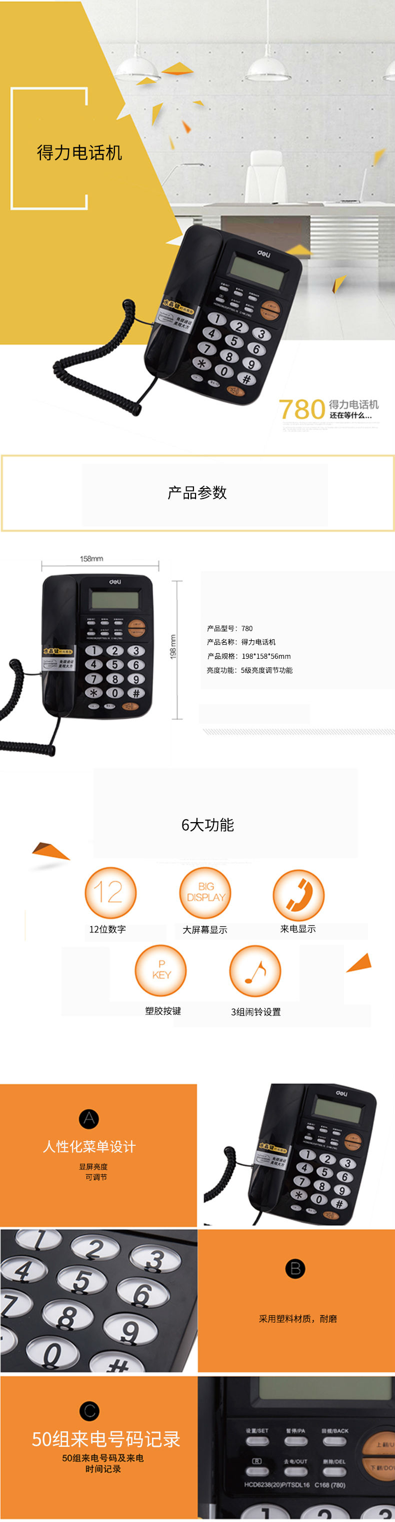 商品名称:得力780电话机(黑)