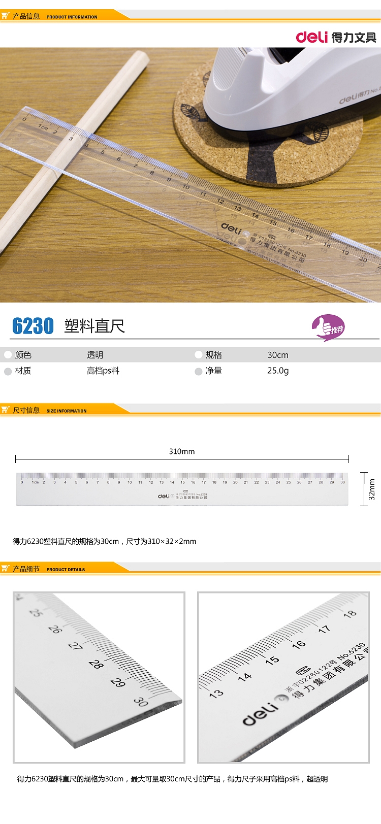 商品名称:得力(deli)30cm办公通用直尺 6230