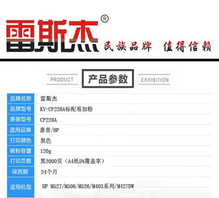 商品名称:雷斯杰 KY-CF228A(标准易加粉)黑色硒鼓 适用惠普:M527/M403系列/M427DW