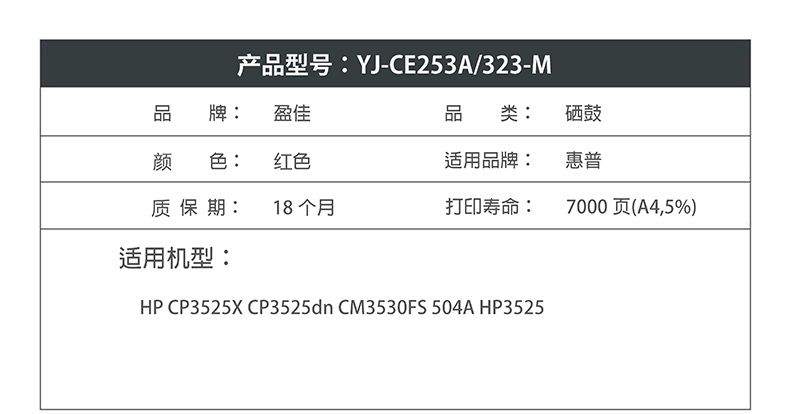 商品名称:盈佳YJ CE253A(504A)/323红色硒鼓(带芯片) 适用:HP CP3525X CP3525dn CM3530FS 504A HP3525