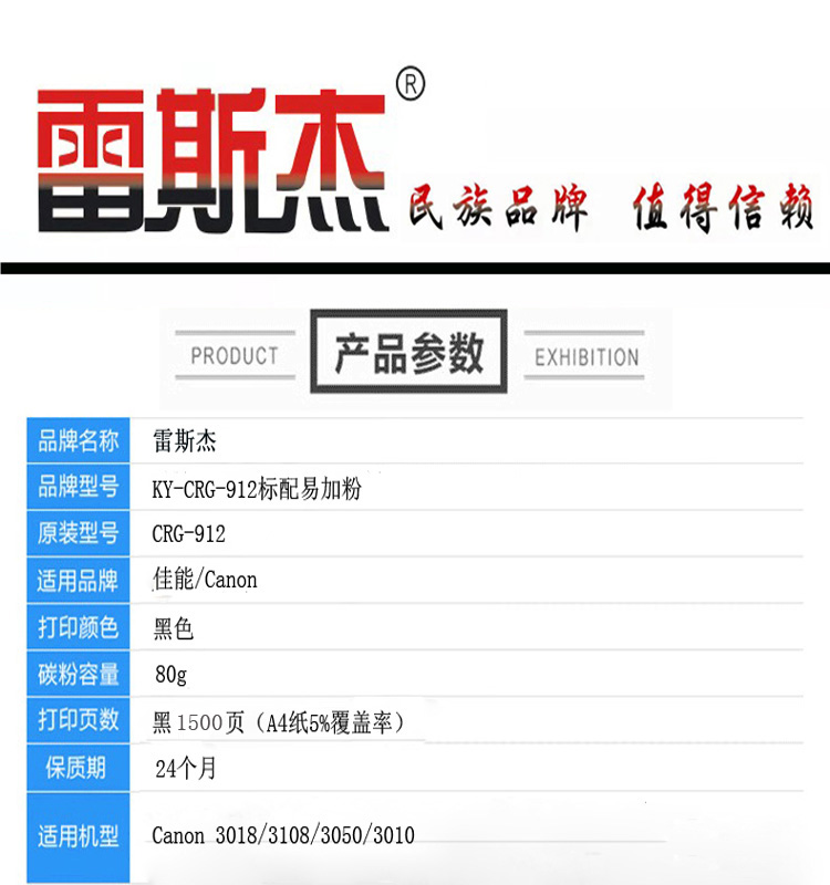 商品名称:雷斯杰 KY-CRG912(标准易加粉)黑色硒鼓 适用佳能:Canon3018/3108/3050/3010