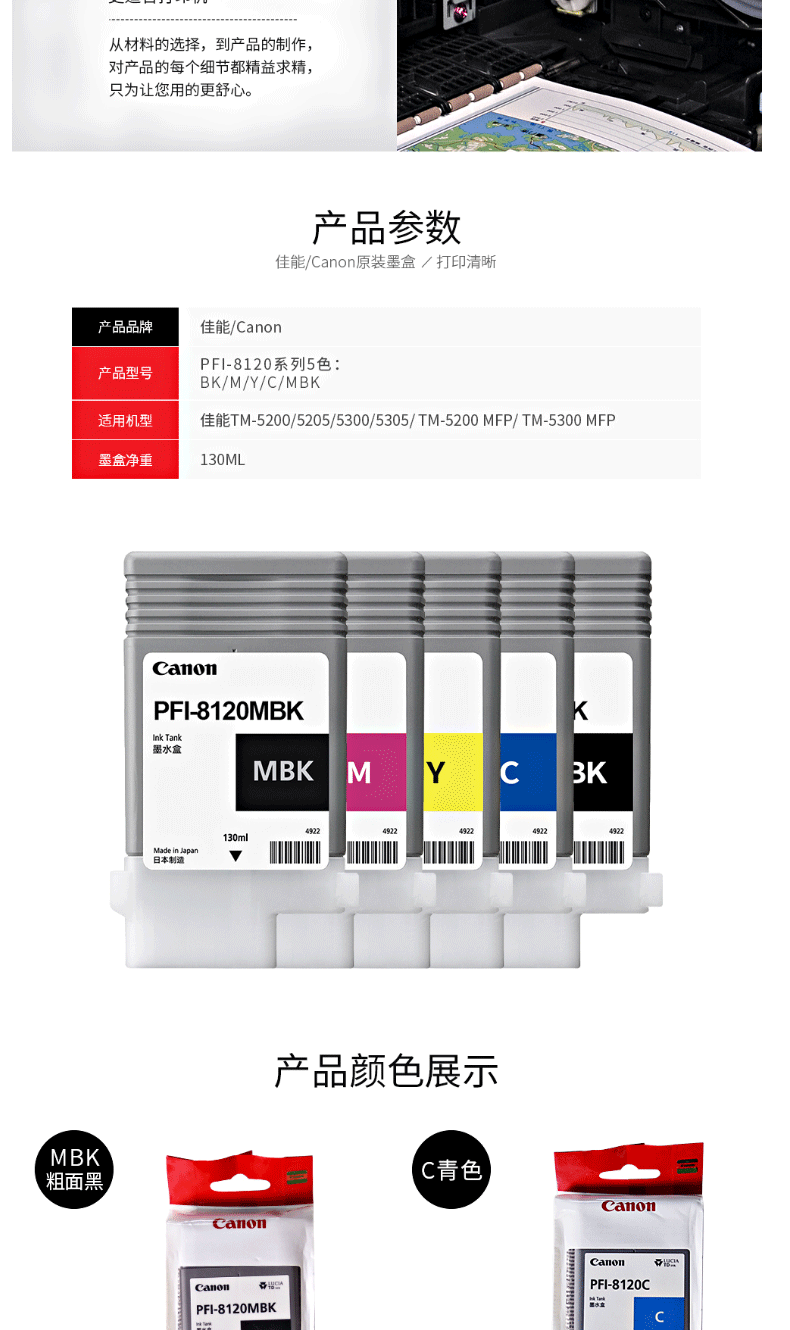 商品名称:佳能 (Canon) TM-5300/5305/5200/5205原装墨盒PFI-8120 (130ML)BK 照片黑