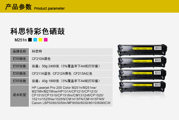 适用机型:HP LaserJet Pro 200 Color M251n/M251nw/M276fn/M276fnw/HP131A/CP1215/CP1210/CP1515/CP1510/CP1518ni/CM1312nfi/CP1520/1521n/1525Nw/1525N/CM1415FN/CM1415FNW/Canon LBP5050/5050n/MF8050/8030/8010/8080CW