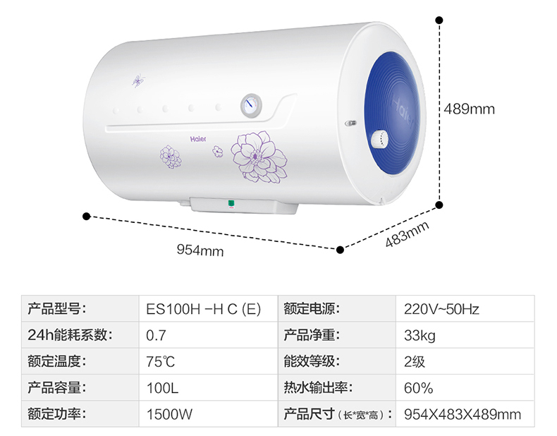 商品名称:海尔(Haier)100L储水式电热水器 大容量电加热 ES100H-HC(E)(安装免费,材料费另收)