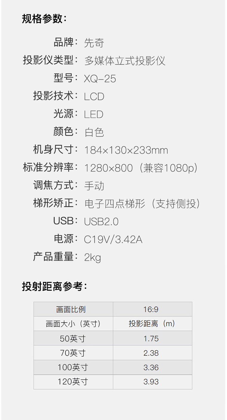 商品名称:先奇(XIANQI)XQ-25 投影仪 办公投影机 (兼蓝光1080P 电子梯形校正 智能系统 AI语音 手机同屏)