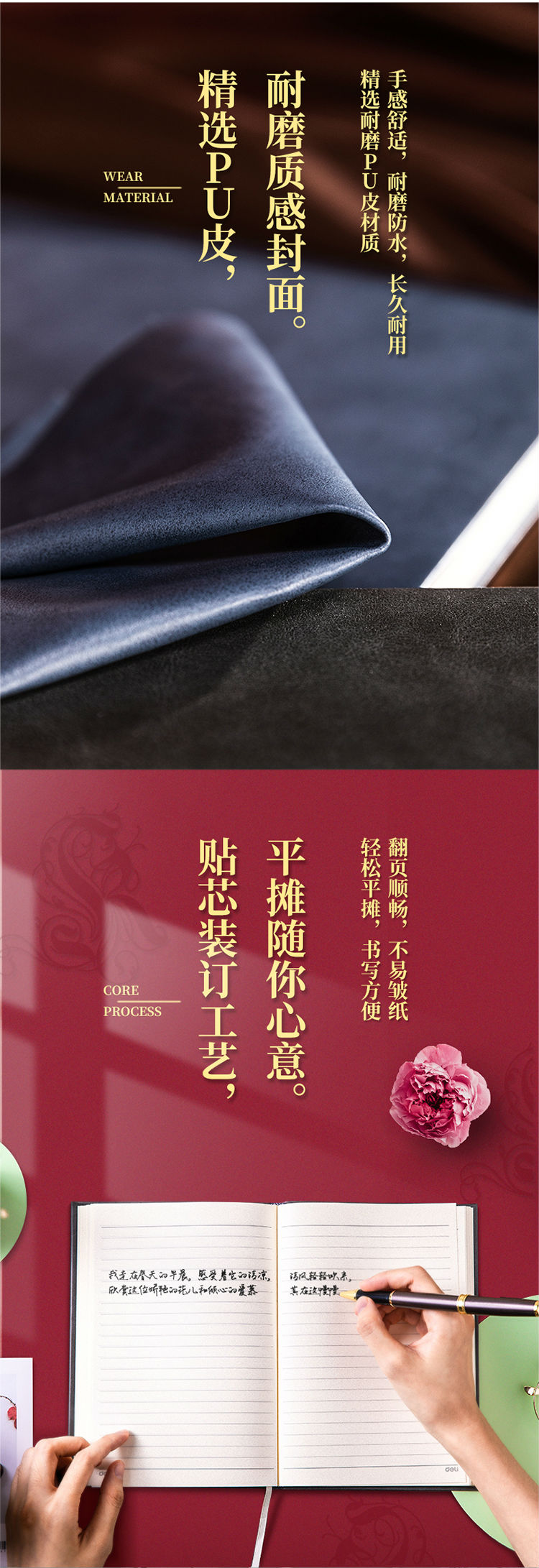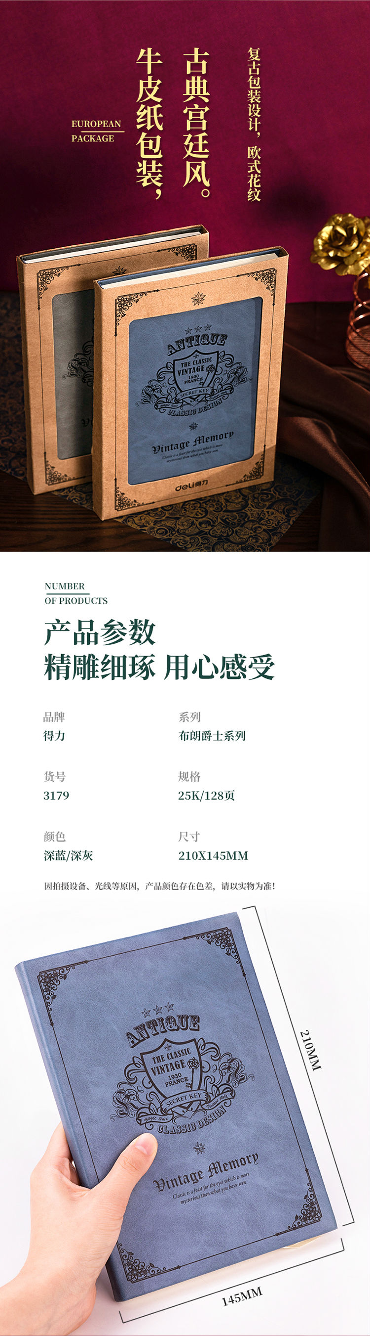 商品名称:得力3179布朗爵士系列皮面本-130页-25K(深灰)
