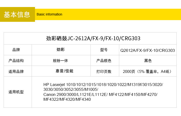商品名称:劲彩Q2612A硒鼓 适用HP LaserJet M1005 佳能FX-9 FX10 CRG303